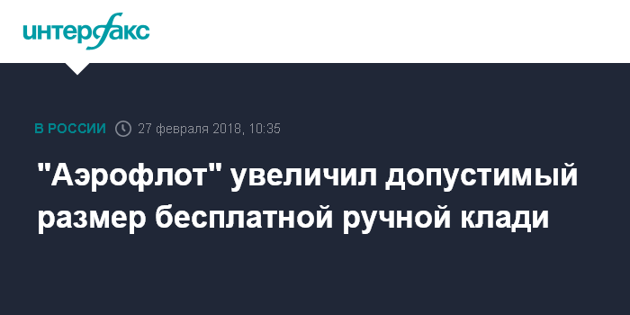 Москва. 27 февраля. INTERFAX.RU - "Аэрофлот" изменил правила провоза ручной клади пассажирами в салоне самолета. Как следует из сообщения перевозчика, габариты одного места ручной клади для всех классов обслуживания не должны превышать: 55 см в длину, 40 см в ширину, 25 см в высоту.