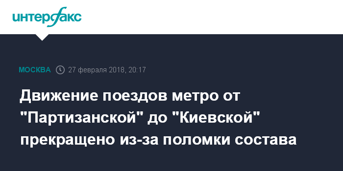 Москва. 27 февраля. INTERFAX.RU - Движение поездов на участке Арбатско-Покровской линии от станции "Партизанская" до станции "Киевская" прервано около 19:30. Об этом сообщил во вторник "Интерфаксу" источник в транспортном комплексе столицы.