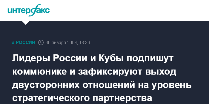 Москва. 30 января. INTERFAX.RU - Лидеры России и Кубы в совместном коммюнике намерены зафиксировать выход двусторонних отношений на уровень стратегического партнерства, сообщил в ходе переговоров с президентом РФ Дмитрием Медведевым председатель Госсовета и Совета министров Кубы Рауль Кастро.