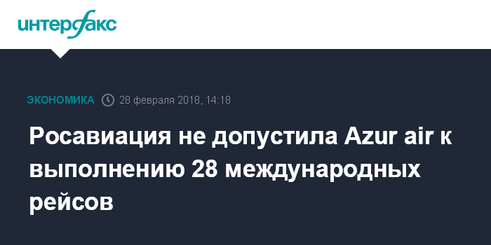 Москва. 28 февраля. INTERFAX.RU - Росавиация отказала в допуске авиакомпании AZUR air на выполнение 28 международных рейсов, говорится в материалах ведомства.