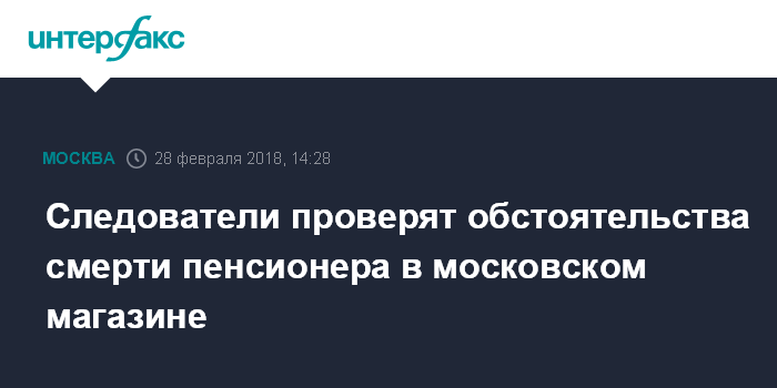 Москва. 28 февраля. INTERFAX.RU - Следователи устанавливают обстоятельства смерти пенсионера в магазине в центре Москвы, сообщается в телеграм-канале Следственного комитета в среду.