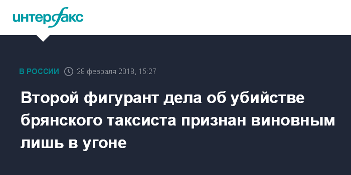 Москва. 28 февраля. INTERFAX.RU - Второй фигурант уголовного дела об убийстве брянского таксиста признан виновным лишь в угоне автомобиля
