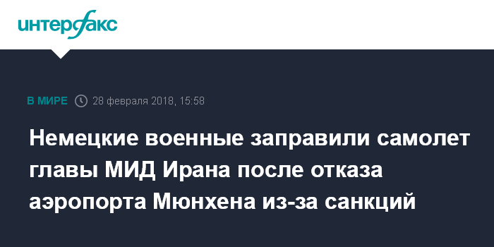 Москва. 28 февраля. INTERFAX.RU - Министерство обороны Германии заявило, что ранее в феврале провело заправку самолета министра иностранных дел Ирана Джавада Зарифа после Мюнхенской конференции по безопасности, сообщает в среду агентство Associated Press.