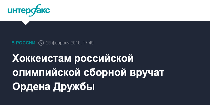 Хоккеистам российской сборной - олимпийским чемпионам вручат Ордена Дружбы. Этот же орден был вручён олимпийской чемпионке по фигурному катанию Алине Загитовой, серебряному призёру по фигурному катанию Евгении Медведевой, серебряным призёрам по лыжным гонкам Александру Большунову и Денису Спицову.