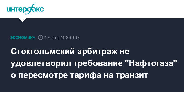 Москва. 1 марта. INTERFAX.RU - Стокгольмский арбитраж не удовлетворил требование НАК "Нафтогаз Украины" на пересмотр тарифа на транзит в контракте с ПАО "Газпром", говорится в пресс-релизе НАК.