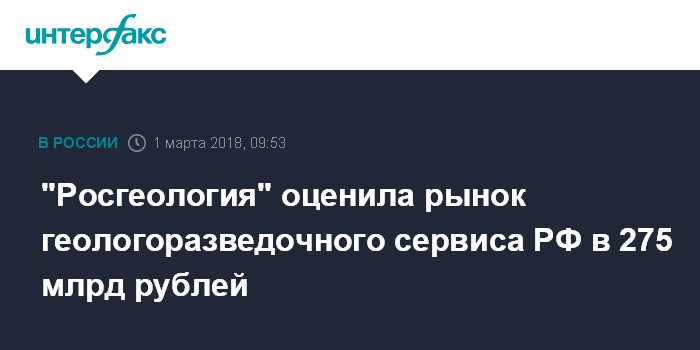 Москва. 1 марта. INTERFAX.RU - Весь рынок геологоразведочных сервисных услуг в России оценивается примерно в 275 млрд рублей без НДС, доля "Росгеологии" составляет около 13%. Такое мнение в интервью газете "Ведомости" высказал гендиректор "Росгеологии" Роман Панов.