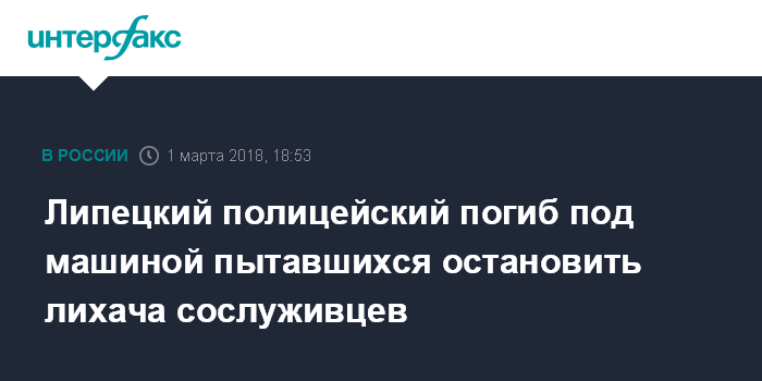Москва. 1 марта. INTERFAX.RU - Липецкий полицейский погиб при исполнении служебных обязанностей, сообщила в четверг пресс-служба СУ СКР по региону.