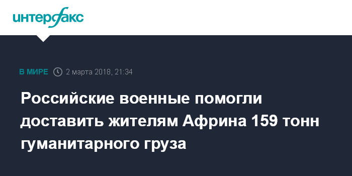 Москва. 2 марта. INTERFAX.RU - Российские военные помогли провести гуманитарный конвой ООН в сирийский Африн, сообщил начальник российского центра по примирению враждующих сторон в Сирии генерал-майор Юрий Евтушенко.