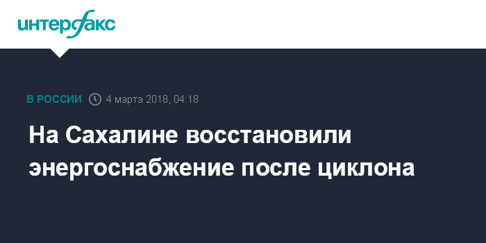 Москва. 4 марта. INTERFAX.RU - Полностью восстановлено энергоснабжение, нарушенное на юге Сахалина при прохождении мощного циклона, сообщило в воскресенье ПАО "Сахалинэнерго".