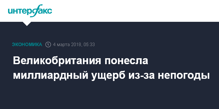 Москва. 4 марта. INTERFAX.RU - За одну неделю морозной погоды Великобритания понесла убытки не менее миллиарда фунтов стерлингов (почти $1,4 миллиарда) и рискует в два раза сократить темпы роста ВВП за первые месяцы текущего года, сообщила газета The Guardian.