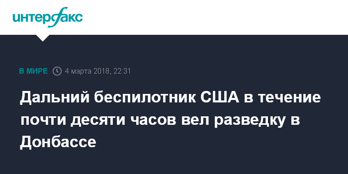 Москва. 4 марта. INTERFAX.RU - Стратегический беспилотный летательный аппарат ВВС США RQ-4B в воскресенье провел почти десятичасовой разведывательный полет вдоль линия разграничения в Донбассе, свидетельствуют мониторинговые данные западных авиационных ресурсов.