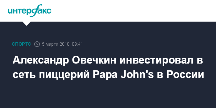 Москва. 5 марта. INTERFAX.RU - Хоккеист сборной России и клуба НХЛ "Вашингтон Кэпиталз" Александр Овечкин стал одним из инвесторов американской сети Papa John's в России, СНГ и Центральной Европе, сообщают "Ведомости", приводя слова президента PJ Western (мастер-франчайзи Papa John's) Кристофера Уинна.