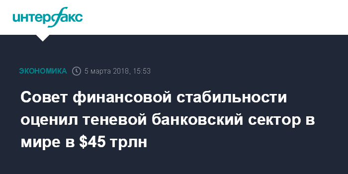 Москва. 5 марта. INTERFAX.RU - Объем теневого банковского сектора в мире достиг $45,2 трлн, или 13% от активов мировой финансовой системы в 29 исследованных странах и территориях, говорится в докладе Совета финансовой стабильности (Financial Stability Board, FSB).