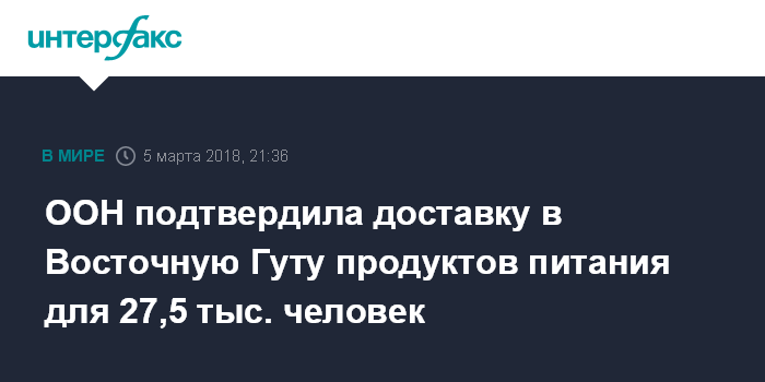 Москва. 5 марта. INTERFAX.RU - Около 27,5 тысяч жителей населенного пункта Дума смогут получить гуманитарную помощь от ООН и "Красного полумесяца" после того, как гумконвой благополучно вошел на территорию Восточной Гуты. Об этом сообщили в понедельник в Управлении ООН по координации гуманитарных вопросов (УКГВ).