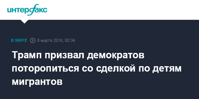Москва. 6 марта. INTERFAX.RU - Президент США Дональд Трамп заявил о готовности заключить с демократами сделку по "Программе отложенных действий" в отношении детей мигрантов (DACA).