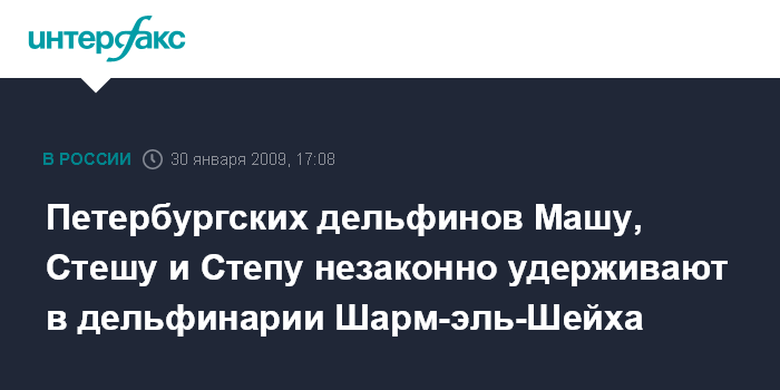 Москва. 30 января. INTERFAX.RU - Три петербургских дельфина незаконно удерживаются в одном из египетских дельфинариев. "Дельфины Маша, Стеша и Степа, то есть две самки и самец, уже в течение многих недель незаконно содержатся в дельфинарии Шарм-эль-Шейха. Животные были сданы в аренду, а когда, согласно договору, пришло время их возвращать, дельфинов просто не отдали", - рассказали "Интерфаксу" в пятницу в Утришском дельфинарии Петербурга.