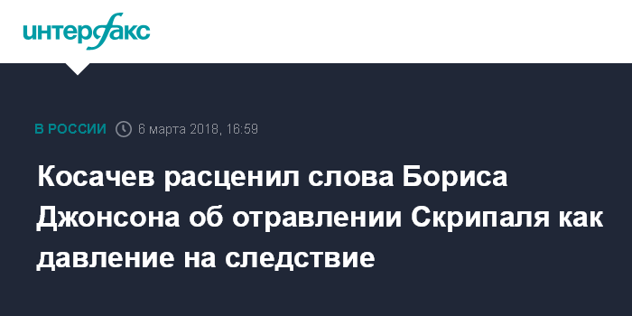 Москва. 6 марта. INTERFAX.RU - Озвучивание главой МИД Великобритании Борисом Джонсоном непроверенной версии о возможной причастности РФ к инциденту с экс-сотрудником ГРУ Сергеем Скрипалем выглядит как недобросовестная политика и давление на следствие, это неприемлемо, заявил глава комитета Совета Федерации по международным делам Константин Косачев.