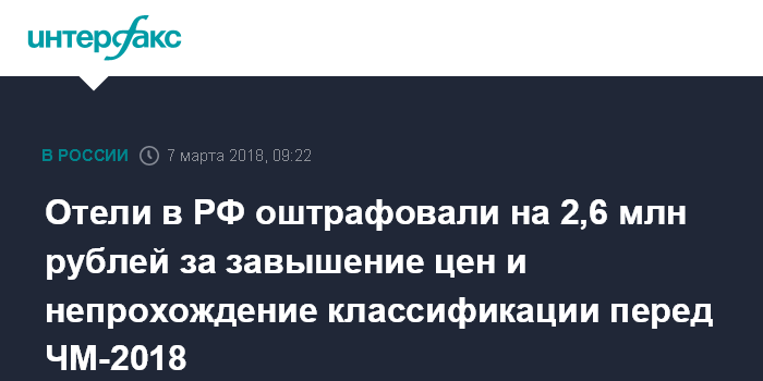 Отели в РФ оштрафовали на 2,6 млн рублей за завышение цен и непрохождение классификации перед ЧМ-2018