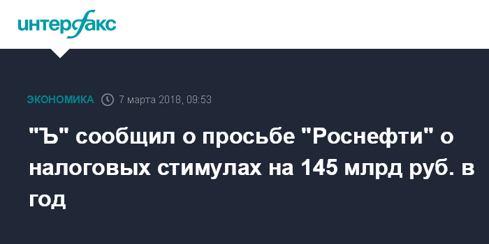"Ъ" сообщил о просьбе "Роснефти" о налоговых стимулах на 145 млрд руб. в год
