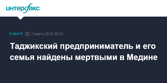 Москва. 7 марта. INTERFAX.RU - Таджикский предприниматель Бахтиер Додохонов, его жена и двое сыновей найдены мертвыми в отеле в Медине, сообщают в среду таджикские СМИ.