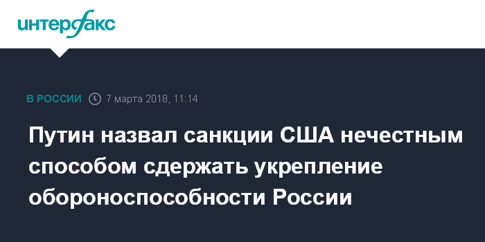Москва. 7 марта. INTERFAX.RU - Американские санкционные списки - это попытка сдержать рост обороноспособности страны и способ нечестной конкурентной борьбы, заявил президент РФ Владимир Путин.