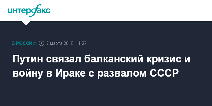 Москва. 7 марта. INTERFAX.RU - Президент России Владимир Путин считает, что уход Советского Союза с политической арены после развала страны привел к серьезным изменениям расклада сил на планете и послужил косвенной причиной кризиса на Балканском полуострове и вооруженного конфликта в Ираке.