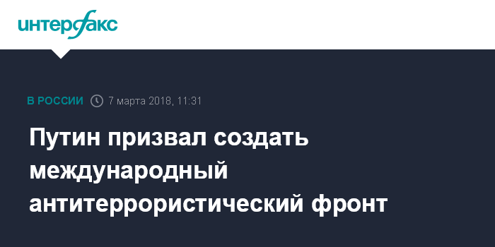 Москва. 7 марта. INTERFAX.RU - Президент РФ Владимир Путин призвал к созданию единого международного антитеррористического фронта "на поле боя".