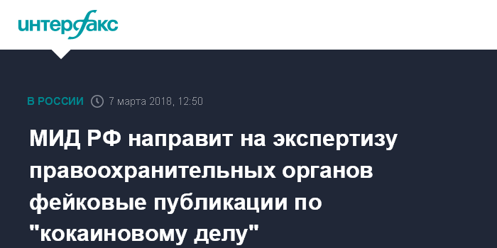 Москва. 7 марта. INTERFAX.RU - Официальный представитель МИД РФ Мария Захарова заявила, что фейковые материалы, размещенные на зарубежных ресурсах по так называемому "кокаиновому делу", будут переданы на экспертизу в правоохранительные ведомства РФ, в том числе, и для возможного приобщения к материалам уголовного дела.