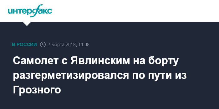 Москва. 7 марта. INTERFAX.RU - Разгерметизация произошла в самолете, на котором лидер "Яблока", кандидат в президенты РФ Григорий Явлинский во вторник возвращался из Грозного в Москву, сообщил пресс-секретарь партии Игорь Яковлев.