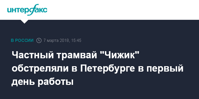 "Трамвай "Чижик" маршрута №8 следовал по проспекту Наставников в сторону станции метро "Ладожская". В районе перекрестка Наставников и Ленской лопнуло два стекла. Пассажиры не пострадали. Состав остановился, пассажиров высадили. После этого трамвай вернулся в депо. Причины произошедшего устанавливаются", - сообщили "Интерфаксу" в пресс-службе ООО "Транспортная концессионная компания" (ТКК) в среду, подтвердив факт обстрела из травматического оружия.