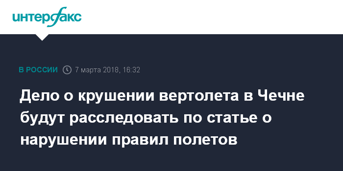 Москва. 7 марта. INTERFAX.RU - Уголовное дело о нарушении правил полета, повлекшем тяжкие последствия, возбуждено по факту крушения вертолета Ми-8 в Чечне, говорится в официальном Telegram-канале Следственного комитета России (СКР).