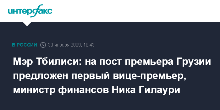 Москва. 30 января. INTERFAX.RU - Новым премьер-министром Грузии станет Ника Гилаури, который занимает пост первого вице-премьера и министра финансов, утверждает мэр Тбилиси Гиги Угулава. "Новым премьер-министром Грузии будет Ника Гилаури. Соответствующее решение президент уже принял", - сказал он в пятницу вечером журналистам.