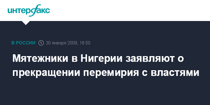 Москва. 30 января. INTERFAX.RU - Мятежники из Движения за эмансипацию дельты Нигера, действующие на юге Нигерии, объявили в пятницу об окончании перемирия с местными властями.
