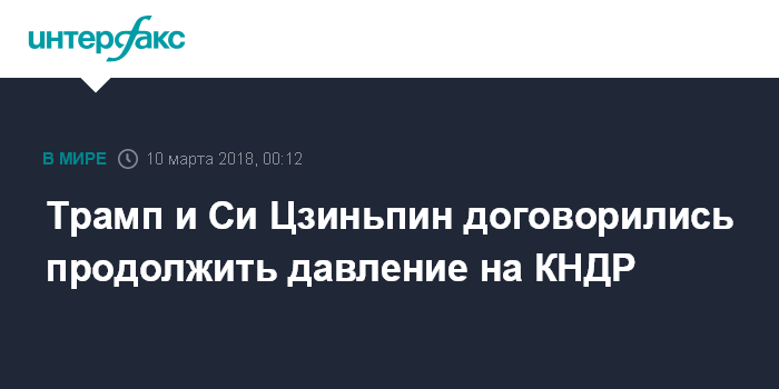 Москва. 10 марта. INTERFAX.RU - Президент США Дональд Трамп и председатель КНР Си Цзиньпин в ходе телефонного разговора выразили намерение продолжать политику давления и санкции против КНДР до принятия северокорейцами конкретных шагов по денуклеаризации Корейского полуострова, сообщает Белый дом.