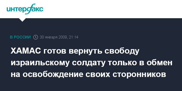 Москва. 30 января. INTERFAX.RU - Палестинская радикальная группировка ХАМАС готова вернуть свободу израильскому солдату Гиладу Шалиту только в обмен на освобождение ряда своих сторонников. "Пусть весь мир внимательно слушает: Шалит не будет отпущен до тех пор, пока наши сторонники также не окажутся на свободе", - заявил в пятницу в Газе один из лидеров ХАМАС, Халил аль-Хайя.