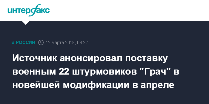 Москва. 12 марта. INTERFAX.RU - Воздушно-космические силы (ВКС) России в апреле пополнятся 22 штурмовиками "Грач" в самой совершенной модификации Су-25СМ3, сообщил "Интерфаксу" информированный источник в авиационной отрасли.