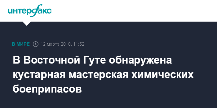 Москва. 12 марта. INTERFAX.RU - Правительственные войска Сирии при зачистке населенного пункта Афтрис в Восточной Гуте после выхода оттуда боевиков обнаружили кустарную мастерскую по изготовлению химических боеприпасов, сообщил журналистам в понедельник полковник сирийской армии Ферраз Ибрагим.