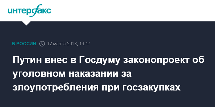 Москва. 12 марта. INTERFAX.RU - Президент РФ Владимир Путин внес на рассмотрение Госдумы законопроект о введении уголовной ответственности за злоупотребления при госзакупках и подкуп работников контрактных служб, сообщил в понедельник официальный сайт нижней палаты парламента.