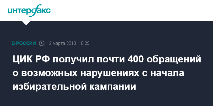 Москва. 12 марта. INTERFAX.RU - Более 380 жалоб о нарушениях выборного законодательства поступили в ЦИК с начала избирательной кампании.
