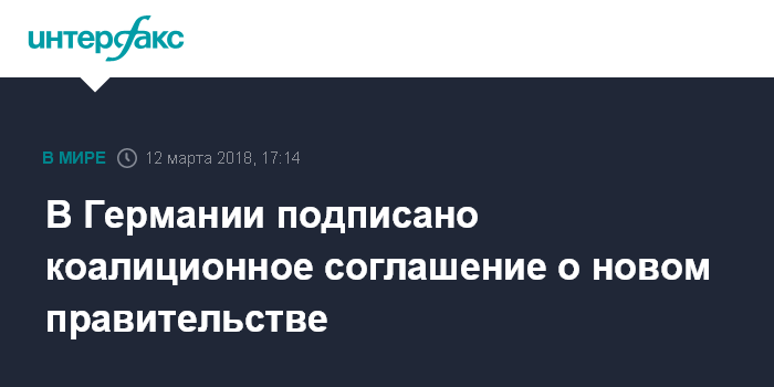 Москва. 12 марта. INTERFAX.RU - Канцлер ФРГ и председатель Христианско-демократического союза (ХДС) Ангела Меркель, председатель Христианско-социального союза (ХСС) Хорст Зеехофер и исполняющий обязанности сопредседателя Социал-демократической партии Германии (СДПГ) Олаф Шольц подписали коалиционное соглашение о создании нового правительства страны. Об этом сообщает в понедельник онлайн-портал газеты Bild.