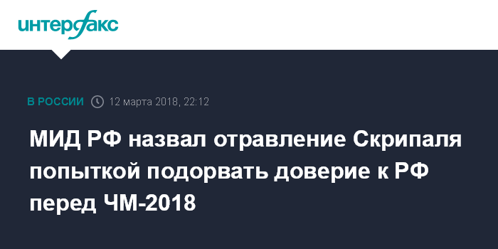 Москва. 12 марта. INTERFAX.RU - Отравление в Великобритании экс-сотрудника ГРУ Сергея Скрипаля стало поводом для развертывания полномасштабной кампании с целью дискредитации РФ и подрыва доверия к ней как к хозяйке ЧМ по футболу, заявили в понедельник в МИД РФ.