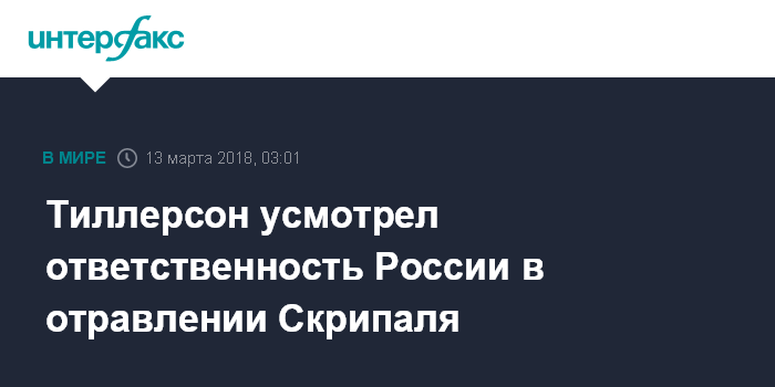 Москва. 13 марта. INTERFAX.RU - Отравление экс-полковника ГРУ Сергея Скрипаля в Великобритании "явно исходит из России" и "безусловно вызовет ответную реакцию", приводит слова госсекретаря США Рекса Тиллерсона агентство Associated Press.