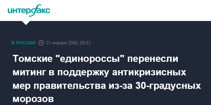 Томск. 31 января. ИНТЕРФАКС-СИБИРЬ - Томское региональное отделение "Единой России" приняло решение перенести митинг в поддержку антикризисных мер, реализуемых руководством страны, из-за сильных морозов, сообщил агентству "Интерфакс-Сибирь" пресс-секретарь отделения Михаил Князев.