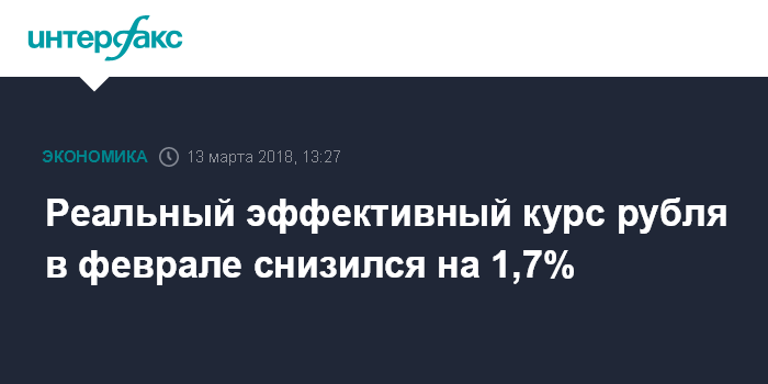 Москва. 13 марта. INTERFAX.RU - Реальный эффективный курс рубля к корзине валют государств - основных торговых партнеров России в феврале 2018 года снизился на 1,7% по отношению к январю, согласно предварительной оценке ЦБ РФ, опубликованной на его сайте.