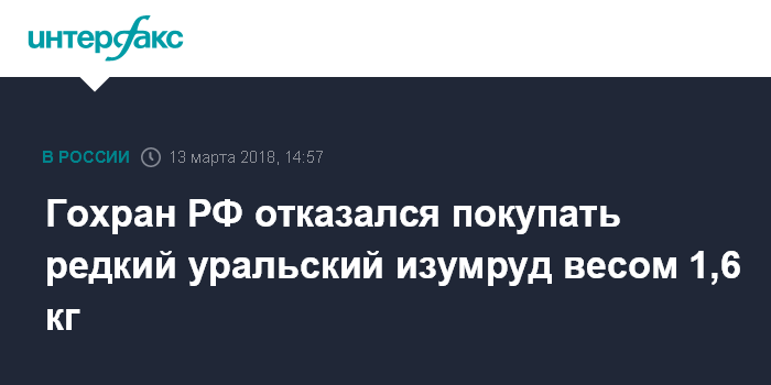 Москва. 13 марта. INTERFAX.RU - Гохран России не стал покупать найденный на Малышевском месторождении (АО "Мариинский прииск", Свердловская область, предприятие "Ростеха") изумруд весом 1,6 кг, предварительно оцененный более чем в 4 млн рублей, сообщили "Интерфаксу" в пресс-службе предприятия.