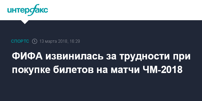 Москва. 13 марта. INTERFAX.RU - Международная федерация футбола (ФИФА) выступила с извинениями за трудности, которые возникли у болельщиков при покупке билетов на матчи чемпионата мира 2018 года в России.