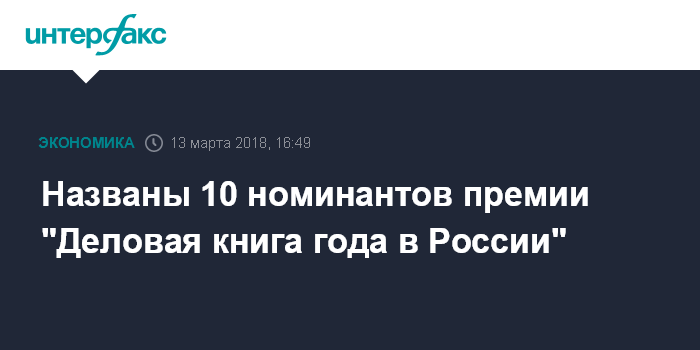 Москва. 13 марта. INTERFAX.RU - Список из 10 претендентов на победу в конкурсе PwC "Деловая книга года в России", отобранных по итогам интернет-голосования на площадке CrowdSpace, передан во вторник экспертному жюри.