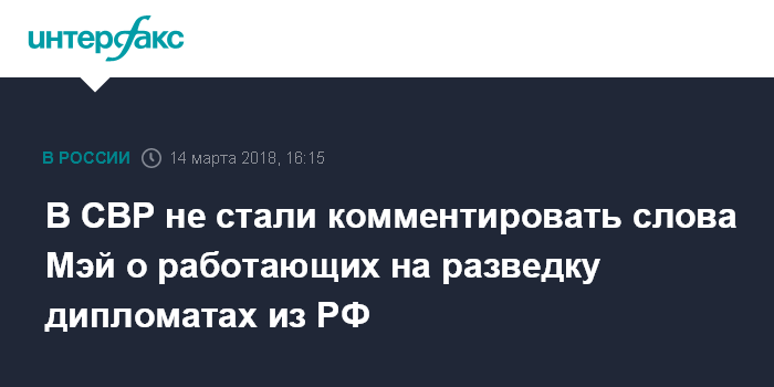 Москва. 14 марта. INTERFAX.RU - Пресс-бюро службы внешней разведки (СВР) РФ воздерживается от комментариев в связи с заявлениями премьер-министра Великобритании Терезы Мэй о высылке российских дипломатов, якобы работающих на разведку.