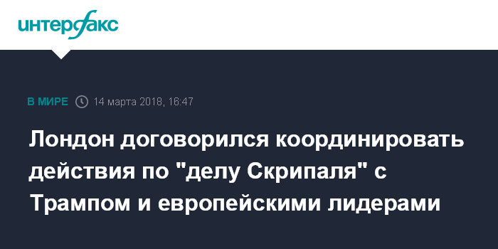 Москва. 14 марта. INTERFAX.RU - Премьер-министр Великобритании Тереза Мэй заявила, что обсудила с президентом США Дональдом Трампом, канцлером Германии Ангелой Меркель и президентом Франции Эммануэлем Макроном необходимость координировать реакцию на дело об отравлении экс-офицера ГРУ Сергея Скрипаля.