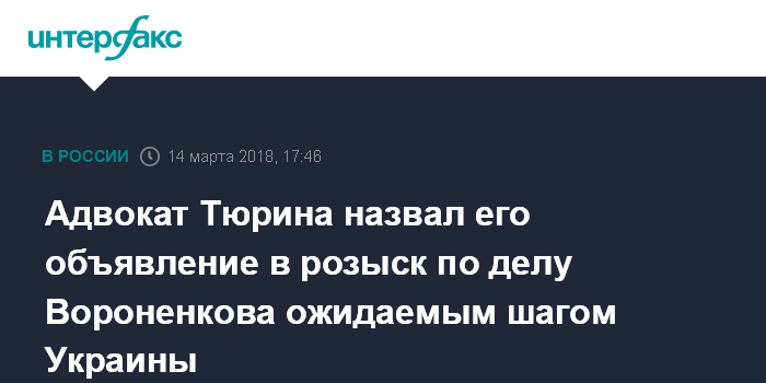 Москва. 14 марта. INTERFAX.RU - Адвокат Владимира Тюрина, обвиняемого в организации убийства бывшего депутата Государственной думы Дениса Вороненкова, назвал ожидаемым шагом со стороны Украины объявление предпринимателя в розыск.